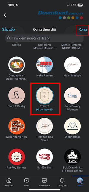 Bước 5: Chạm vào tên Trang mà mọi người không muốn thích nữa để xuất hiện dòng Đã bỏ theo dõi.