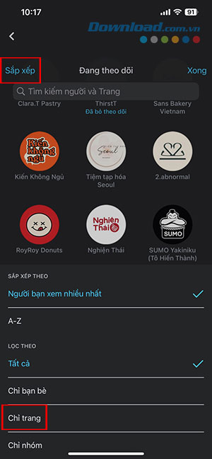 Bước 4: Cuộn xuống cho đến khi thấy một menu ở trên cùng. Nhấn vào Sắp xếp ở góc trên bên trái và chọn Chỉ trang.