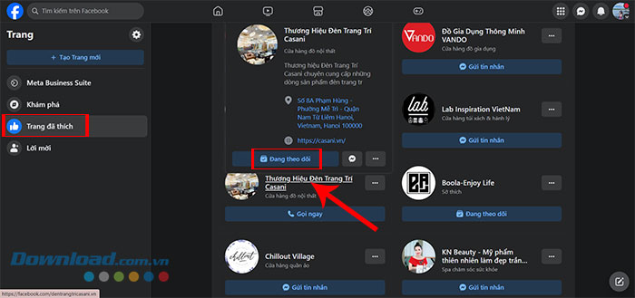 Bước 4: Xác định vị trí Trang mà mọi người muốn hủy theo dõi và nhấn vào nút Đang theo dõi hoặc Đã thích. Khi nút đó chuyển sang Theo dõi hoặc Thích tức là mọi người đã bỏ theo dõi thành công.