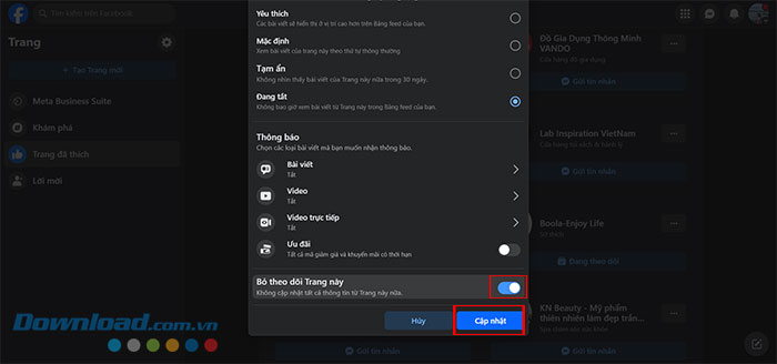 Bước 5: Kéo xuống dưới cùng, bật nút chuyển bên cạnh Bỏ theo dõi Trang này và nhấp vào nút Cập nhật để hủy theo dõi trang thành công. Tiếp tục, thực hiện theo quy trình tương tự cho tất cả các trang mà mọi người muốn hủy theo dõi.