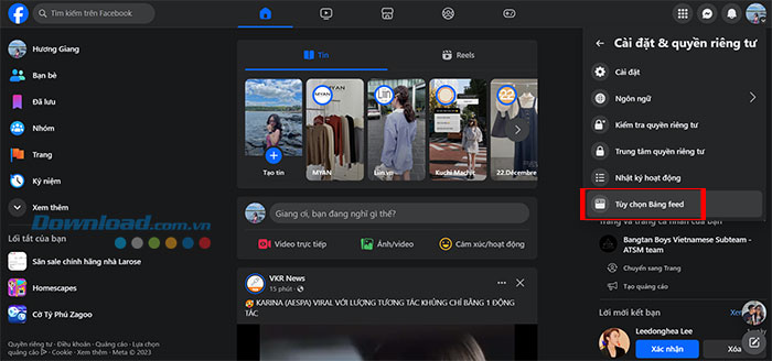 Bước 2: Tiếp tục chọn Tùy chọn Bảng feed.