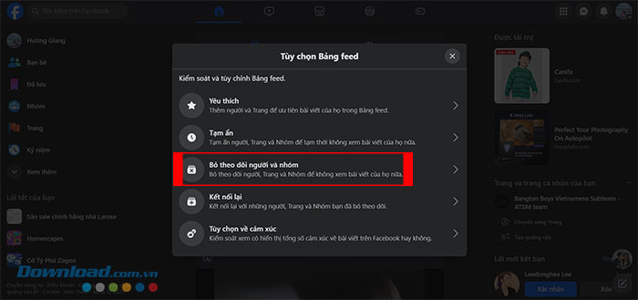 Bước 3: Nhấn vào Bảng tin trong danh mục các Tùy chọn. Tiếp tục chọn Bỏ theo dõi.