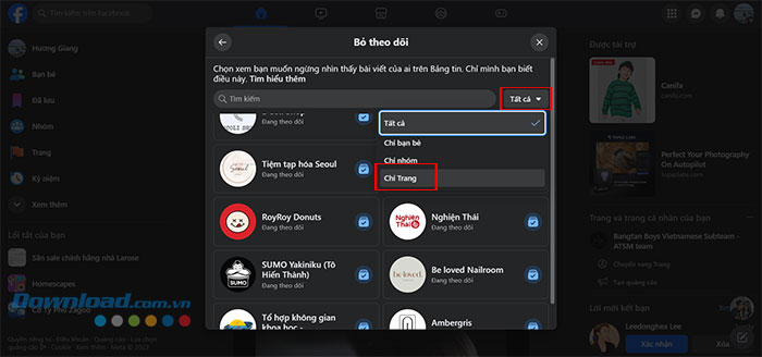Bước 3: Xác định vị trí Trang mà mọi người muốn hủy theo dõi hoặc bỏ thích. Di chuột tới tên trang để hiển thị thêm thông tin tổng quan về trang đó.
