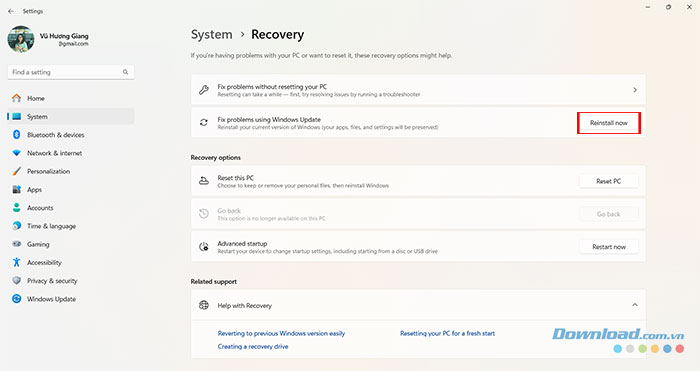 Bước 2: Trong danh sách tùy chọn, chọn Reinstall Now ở phần Fix problems using Windows Update.