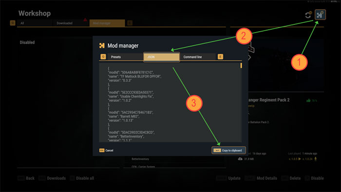 Danh sách các mod mà máy khách yêu cầu sẽ tự động được tải xuống và kích hoạt khi tham gia. Người chơi có thể tạo bằng cách kích hoạt các mod mong muốn trong Workshop, sau đó thông qua trình quản lý Mod, kết quả có thể được chuyển đổi thành chuỗi sẵn sàng sử dụng sau khi điều hướng đến tab JSON rồi nhấp vào nút Copy to clipboard.