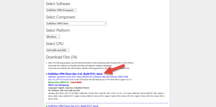 Bước 1: Tải xuống và cài đặt VPN Gate Client Plug-in with SoftEther VPN Client. Intel (x86 và x96) sẽ được chọn tự động làm tùy chọn CPU vì đây là tùy chọn có sẵn cho Windows.