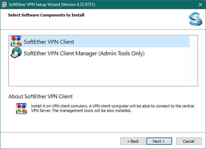 Chọn phiên bản mới nhất của máy khách và cài đặt nó như bất kỳ chương trình Windows nào khác. Khi được hỏi nên cài đặt thành phần nào, hãy chọn SoftEther VPN Client.