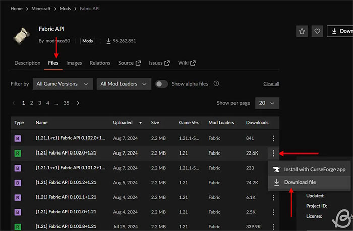 - Truy cập trang Fabric API trên CurseForge. Tìm file mới nhất, nhấp vào biểu tượng ba dấu chấm và chọn Download file để tải về.