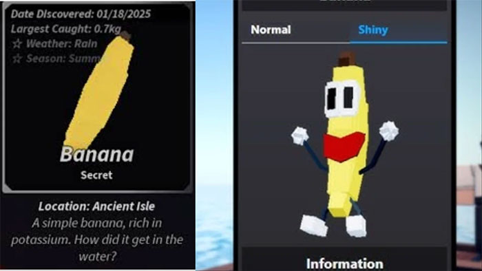 - Banana: Game thủ có thể kiếm được khoảng 12.950 C$ cho mỗi Banana đánh bắt được, tùy thuộc vào kích thước. Trung bình, con cá bí mật này nặng khoảng 0,7kg và được bán với giá 18.500 C$/kg.