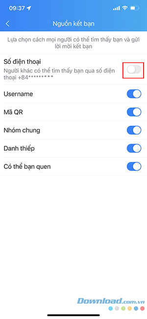 Bước 5: Tắt công tắc chuyển đổi tại Số điện thoại để ngăn người khác tìm thấy mình trên Zalo thông qua số điện thoại.