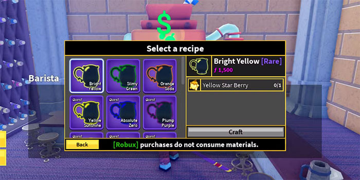 Tùy thuộc vào điều kiện đầu tiên, Barista sẽ cấp quyền truy cập để chế tạo skin tương ứng. Đối với các công thức, một số công thức có sẵn ngay lập tức, trong khi một số khác được mở khóa bằng cách hoàn thành nhiệm vụ. Với các công thức, người chơi có thể chế tạo skin trong Blox Fruits bằng cách sử dụng nhiều Berries và Fragments cho việc này.