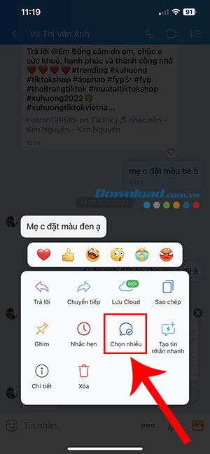 Bước 2: Di chuột tới 1 tin nhắn để xuất hiện biểu tượng ba dấu chấm. Nhấn vào ba dấu chấm đó và chọn Chọn nhiều tin nhắn.