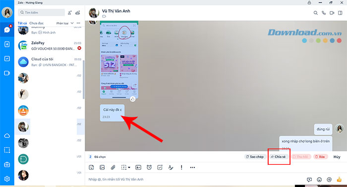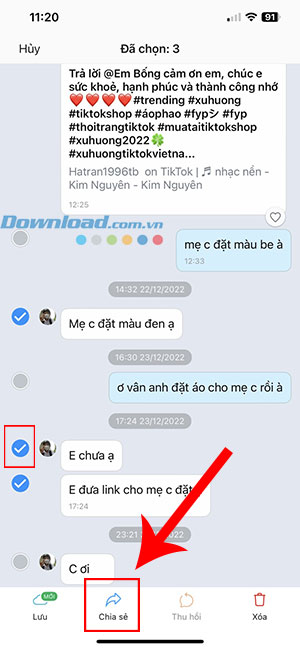 Bước 3: Nhấp chuột vào các tin nhắn muốn chuyển tiếp và nhấn nút Chia sẻ.