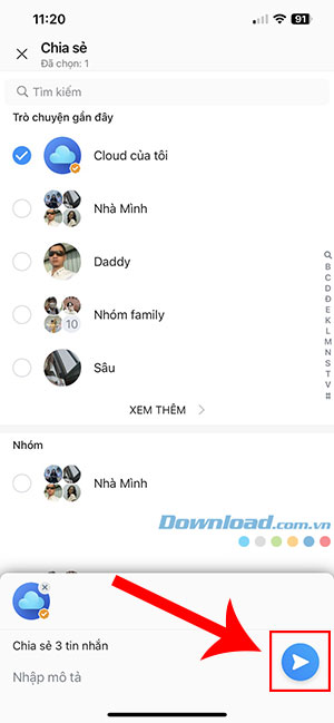 Bước 4: Tại trang Chia sẻ, chọn người nhận tin nhắn, nhập mô tả và nhấn vào biểu tượng gửi để chuyển tiếp toàn bộ tin nhắn đã chọn.
