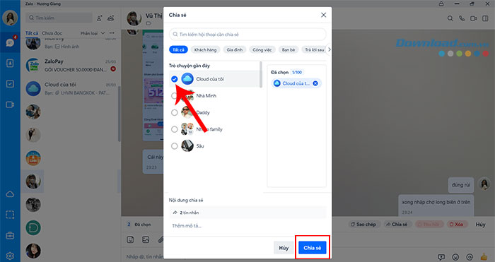 Bước 4: Cuối cùng, chọn người nhận và nhấn Chia sẻ để chuyển tiếp tất cả tin nhắn đã chọn.