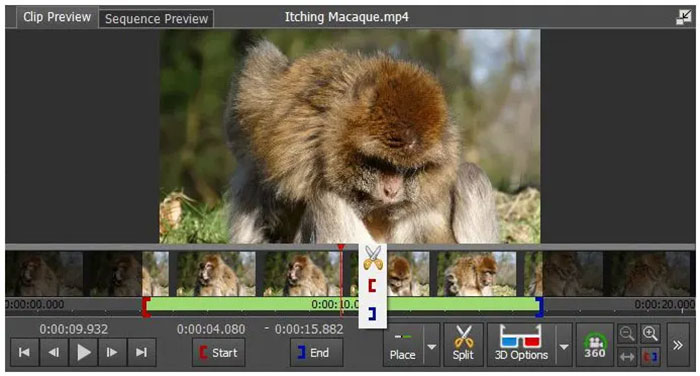 Bước 3: Cắt ngắn video bằng cửa sổ xem trước đoạn clip. Kéo các điểm đánh dấu đỏ và xanh để chọn phần bắt đầu và kết thúc muốn giữ lại. Để tách clip thành hai phần, kéo con trỏ đỏ đến vị trí muốn chia và nhấn vào biểu tượng cái kéo.