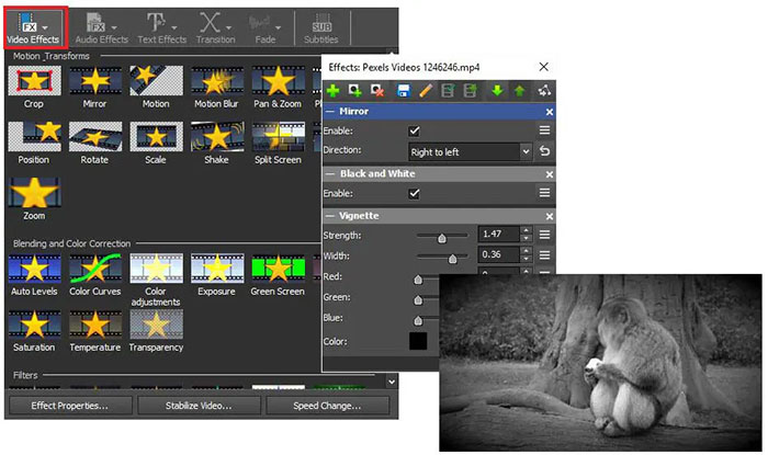 Mọi người có thể áp dụng các hiệu ứng đơn giản như cắt, xoay, hoặc các hiệu ứng đặc biệt như đen trắng (grayscale), phông xanh (greenscreen),...