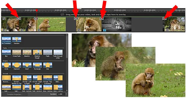 Bước 6: Thêm hiệu ứng chuyển cảnh (Transitions) bằng cách nhấn vào biểu tượng X giữa hai clip trên timeline, sau đó chọn hiệu ứng từ cửa sổ chuyển cảnh.
