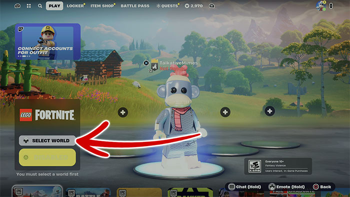 Sau khi chọn LEGO Fortnite, game thủ sẽ được điều hướng đến sảnh LEGO Fortnite. Từ đây, người chơi có thể lập nhóm với bạn bè hoặc chọn Select World ở phía dưới bên trái và tải các thế giới có sẵn.