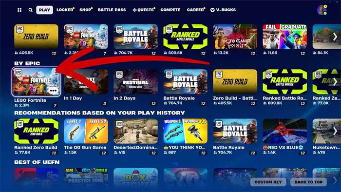 Mọi người LEGO Fortnite có thể tìm thấy LEGO Fortnite trên trang Discover bên dưới màn hình sảnh chính, trong danh sách phát By Epic.