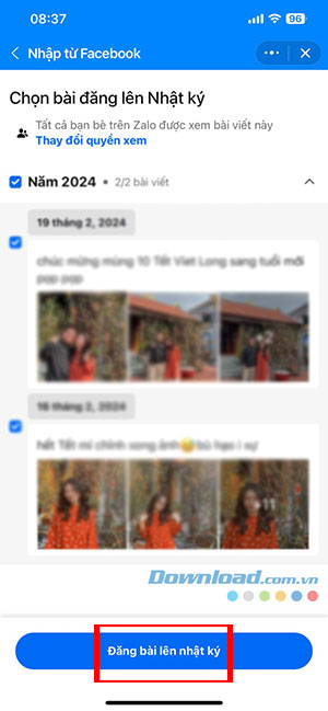 Bước 5: Kiểm tra lại các bài đăng và nhấn Đăng bài lên nhật ký để hoàn tất chuyển bài đăng trên Facebook sang Zalo. Vậy là toàn bộ bài viết Facebook tại khoảng ngày mọi người đã chọn sẽ được đăng lên nhật ký của Zalo.