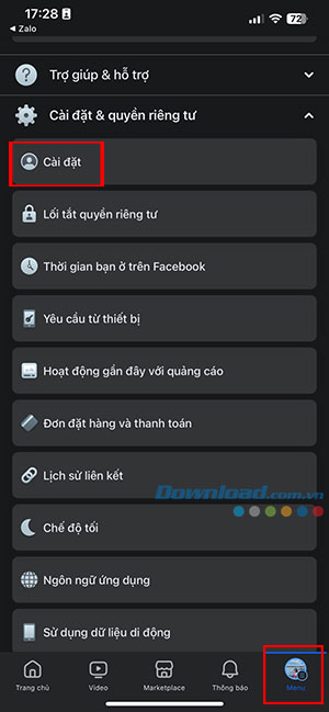 Để tải bài đăng từ Facebook về điện thoại dưới định dạng JSON, người dùng cần mở Facebook, truy cập tab Menu và chọn Cài đặt trong Cài đặt và quyền riêng tư.