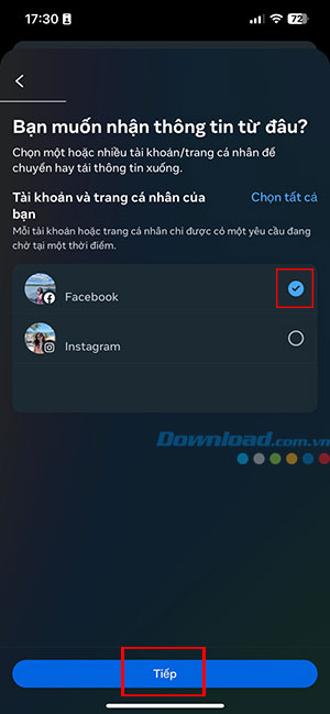 Tiếp theo, chọn tài khoản Facebook mà mọi người muốn tải xuống thông tin và nhấn Tiếp.