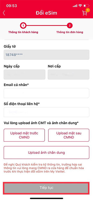 Bước 5: Điền các thông tin cá nhân cần thiết như số điện thoại liên hệ, Email nhận QR code eSIM, tải ảnh CCCD/CMND và ảnh chân dung. Sau đó, nhấn Tiếp tục.