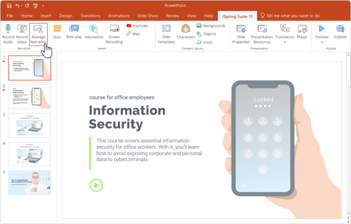 Bước 1: Mở bài thuyết trình trong PowerPoint và nhấp vào Manage Narration trên thanh công cụ iSpring Suite Max.