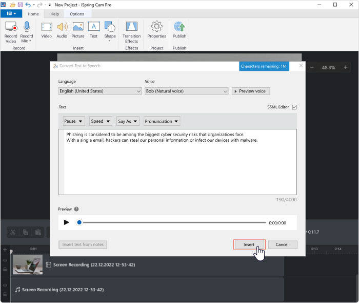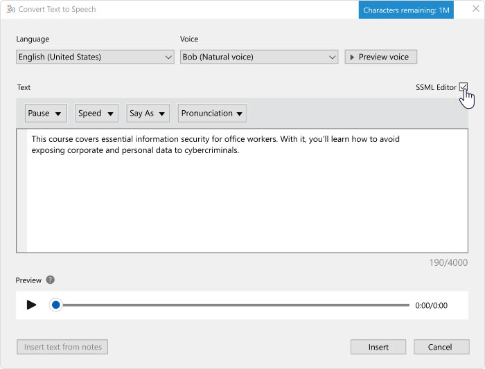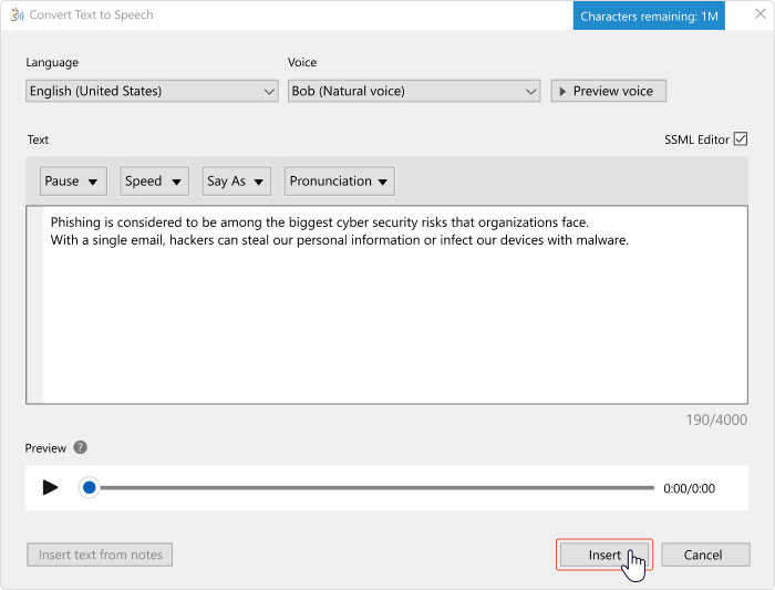 Bước 4: Nhấp vào Preview voice để nghe thử giọng đọc. Sau đó, nhập văn bản và nhấn Insert.