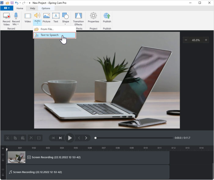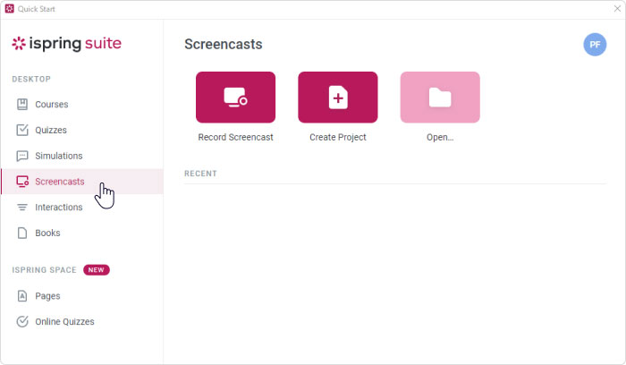 Bước 1: Để thêm giọng nói vào video, hãy chuyển đến Screencasts trên thanh công cụ iSpring Suite Max và mở video hiện có hoặc tạo video mới.