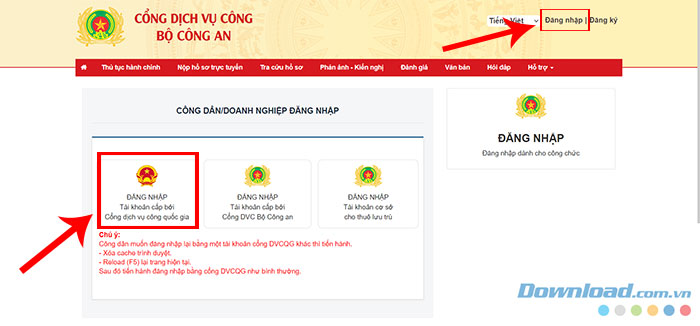 Bước 2: Nhấn nút Đăng nhập và chọn Đăng nhập Tài khoản cấp bởi Cổng dịch vụ công quốc gia.