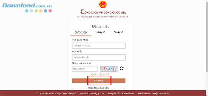 Bước 4: Nhập Tên đăng nhập (số chứng minh thư hoặc căn cước), Mật khẩu và Mã xác thực. Sau đó nhấn nút Đăng nhập.