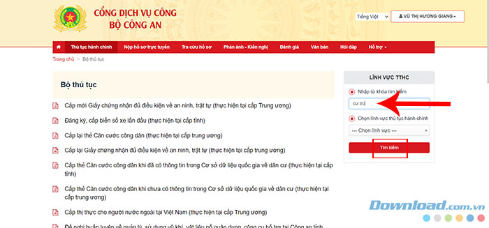 Bước 6: Trong mục Lĩnh vực TTHC, nhập từ khóa cư trú vào thanh tìm kiếm và nhấn Tìm kiếm.