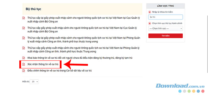 Bước 7: Chọn Xác nhận thông tin về cư trú trong Bộ thủ tục.