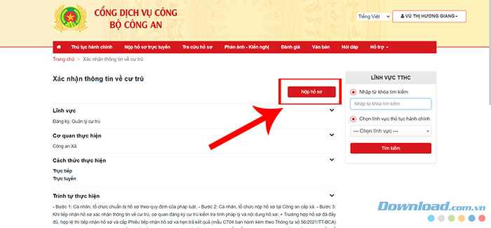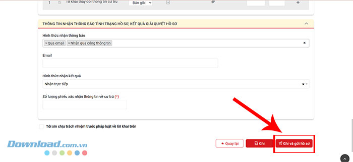 Bước 8: Nhấn nút Nộp hồ sơ trong mục Xác nhận thông tin về cư trú.