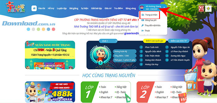 Bước 5: Mọi người cần cập nhật thông tin về trường lớp, tỉnh/thành phố để hệ thống đưa ra bài thi phù hợp. Để sửa đổi thông tin cá nhân, hãy nhấn nút ở trên đầu giao diện có tên và SBD của học sinh > chọn Trang cá nhân.