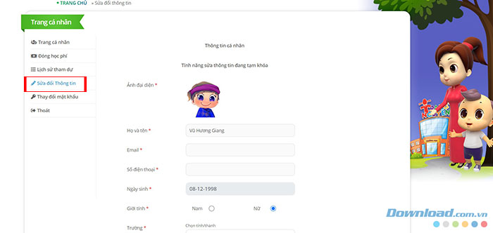Bước 6: Chọn tab Sửa đổi Thông tin và bổ sung các thông tin cá nhân của học sinh để bắt đầu làm bài thi.