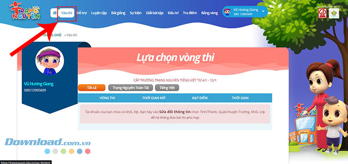 Bước 4: Khi hoàn tất đăng nhập, nhấp vào tab Vào thi để bắt đầu tham gia vòng thi. Người dùng có thể lọc cuộc thi bằng cách nhấn vào tab Tất cả, Trạng Nguyên Toàn Tài hoặc Trạng Nguyên Tiếng Việt.