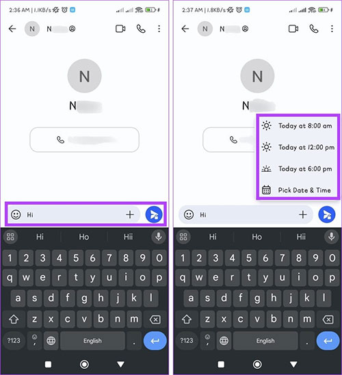 Bước 2: Nhập nội dung tin nhắn, nhấn giữ nút Send và chọn thời gian gửi tin nhắn. Mọi người cũng có thể đặt ngày và giờ cụ thể.