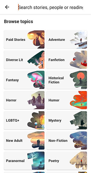 Để bắt đầu, hãy nhấn vào thanh tìm kiếm và duyệt ở trên cùng. Khi làm vậy, Wattpad sẽ hiển thị cho mọi người tất cả các thể loại mà nó hỗ trợ. Nhấn vào một câu chuyện để xem tất cả các câu chuyện thuộc thể loại đó.