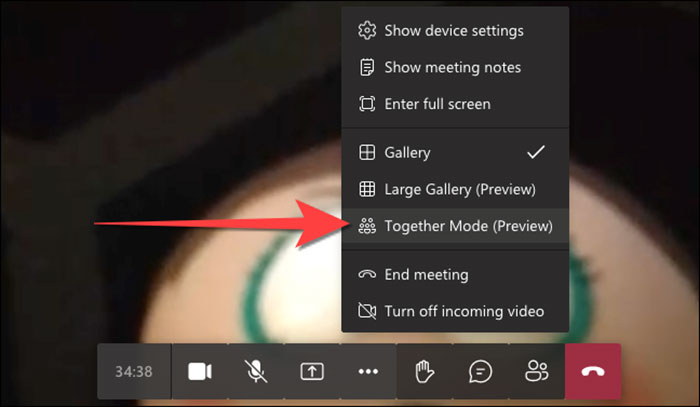 Bước 4: Tiếp tục chọn Together Mode (Preview). Bố cục lưới mặc định sẽ chuyển sang một cảnh giống như khán phòng hiển thị mọi người tham gia vào chỗ ngồi.