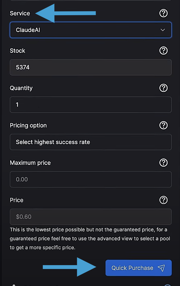 Trong hướng dẫn này, chúng ta sẽ sử dụng số điện thoại của Hoa Kỳ. Sau đó, bên dưới mục Service, tìm kiếm ClaudeAI. Sau khi chọn cả hai, nhấp vào Quick Purchase ở phía dưới.