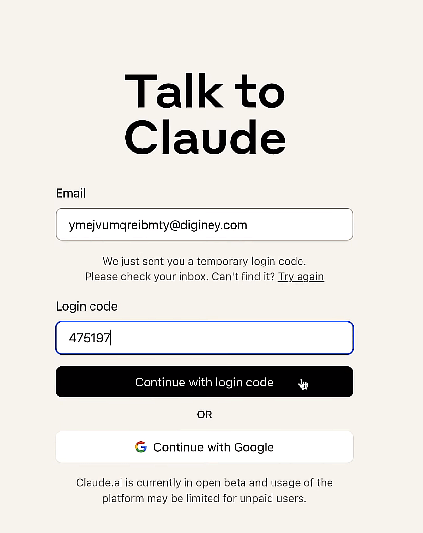 4. Hãy truy cập ClaudeAI.com. Nhập địa chỉ email của bạn và nhập mã xác minh mà họ gửi cho bạn. Để tăng cường quyền riêng tư và bảo mật, hãy sử dụng email dùng 1 lần.