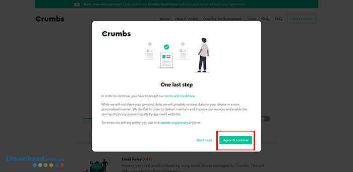Bước 4: Trong thông báo của Crumbs, nhấn nút Agree & Continue.