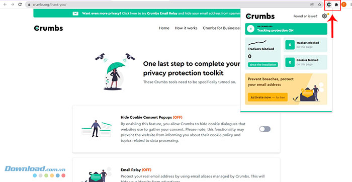 Crumbs là một tiện ích bảo mật phù hợp ngay với trình duyệt web. Nó được xây dựng để ngăn chặn các trình theo dõi, cookie và các nỗ lực xấu nhằm ghi lại thông tin cá nhân của người dùng khi trực tuyến. Người dùng chỉ cần thêm Crumbs vào trình duyệt web như các tiện ích mở rộng khác.