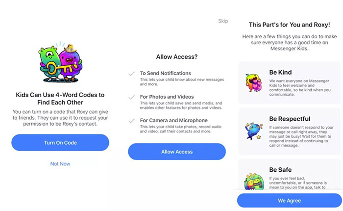 Messenger Kids yêu cầu cha mẹ hoặc người giám hộ đăng ký thay mặt trẻ và không yêu cầu tài khoản Facebook. Messenger Kids không hiển thị quảng cáo hoặc cung cấp dịch vụ mua hàng trong ứng dụng.