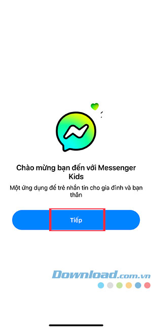 Bước 1:Tải ứng dụng Messenger Kids xuống điện thoại thông minh hoặc máy tính bảng của trẻ rồi mở ứng dụng và chọn Tiếp.