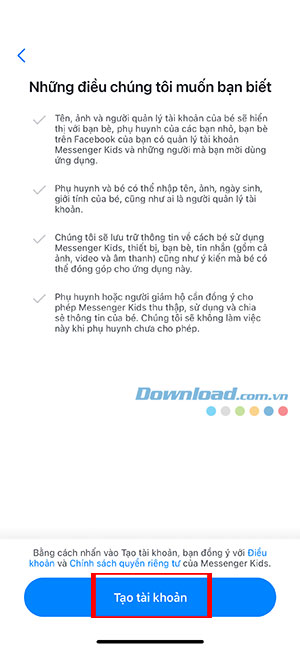 Bước 8: Đồng ý với để các quy tắc của Messenger Kids để hoàn tất quá trình thiết lập tài khoản Messenger Kids.