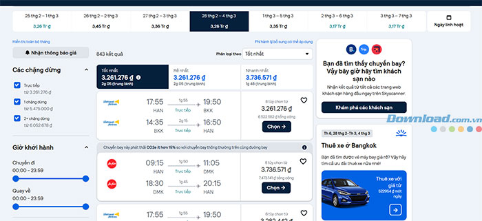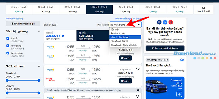 Kết quả được tự động sắp xếp theo tùy chọn Tốt nhất (kết hợp giữa tốc độ và giá), nhưng mọi người cũng có thể sắp xếp theo Rẻ nhất và Nhanh nhất. Trong trường hợp chuyến bay rẻ nhất mất gấp đôi thời gian so với tùy chọn nhanh nhất, nhưng sẽ tiết kiệm được nhiều tiền hơn.